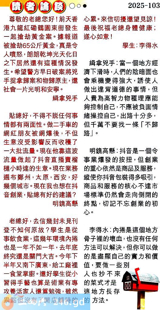 3.老總好,去信幾封未見刊登不知何原故?學生是從事飲食業,這幾年環境內捲也是一年不如一年,去年底終究還是關門大吉。今年下半年又南下廣東,給工廠裡一食堂掌廚。還好學生從小習得手藝也算是術業有專攻養活家人還算勉強,雖然累點但沒有了開店鋪時的心累。來信叨擾還望見諒!最後祝福老總身體健康;遂心如意!學生:李得水