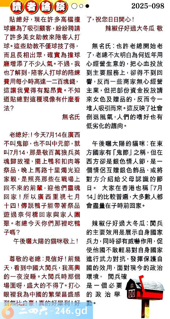 〖無名氏〗:也許老總開始老了,老總不太明白為何近年用心經營生意的,把心血投放到主要服務上,卻得不到回響,反而一些商家無心經營主業,但把部份資金投放請來女色及贈品的,反而令一堆人吸引而來。這反映了社會倒退風氣,人們的嗜好也有低劣化的趨向。