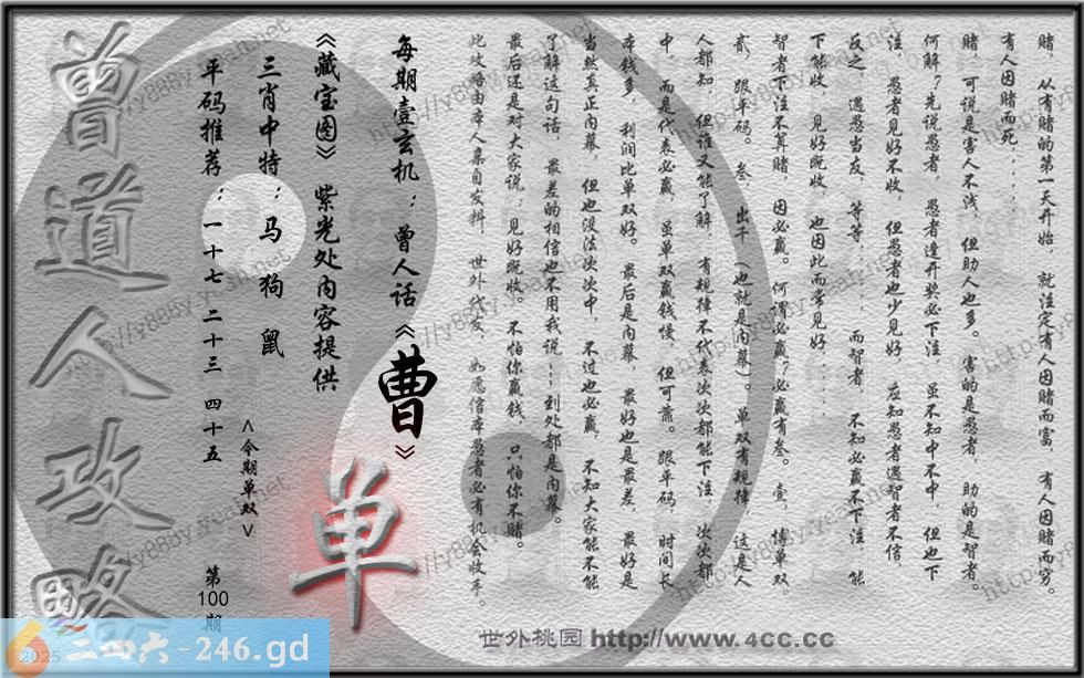 100期藏寶圖 新:勤行惠化活东吴 老:贱妾悠悠心无违 禁:鸡禁:5尾玄機字:《曹》