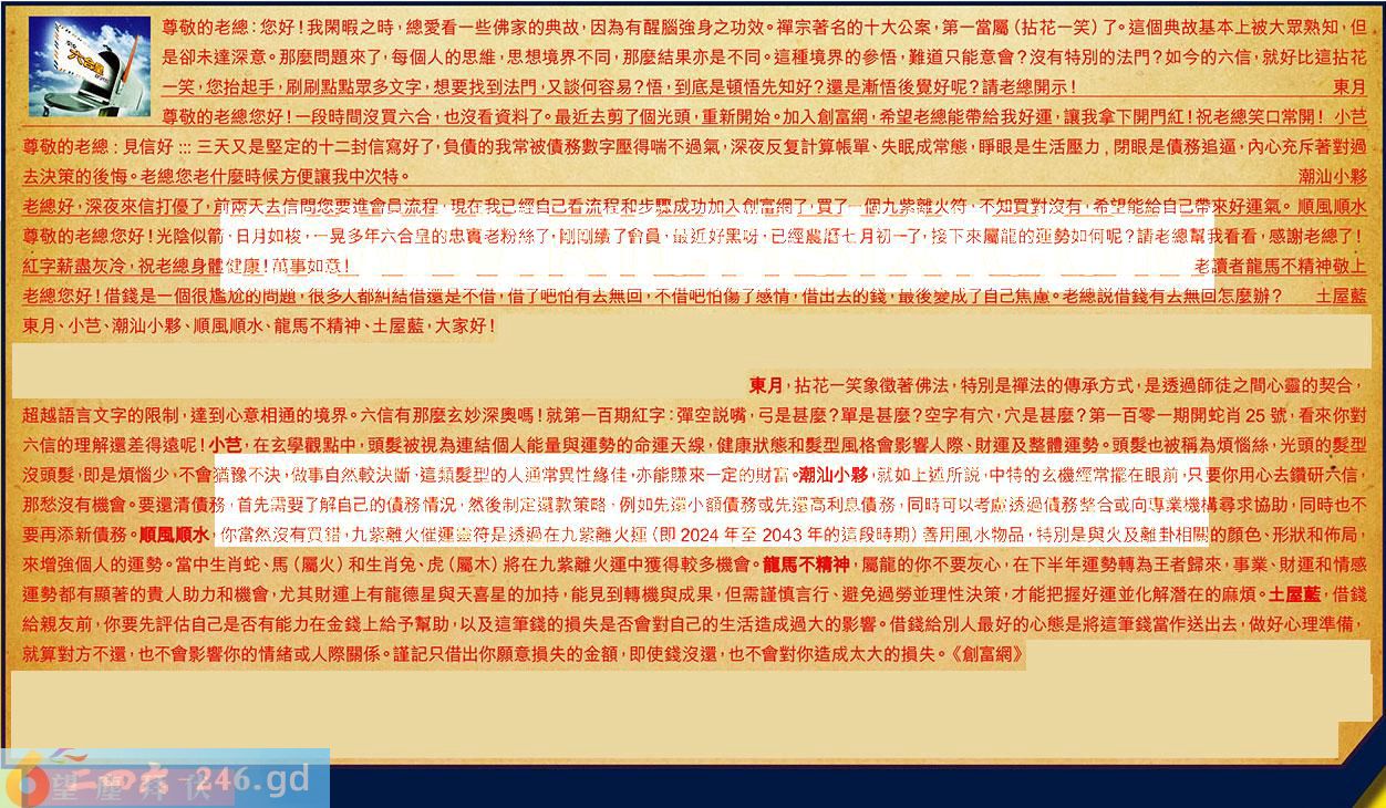 〖東月〗:拈花一笑象徵著佛法,特別是禪法的傳承方式,是透過師徒之間心靈的契合,超越語言文字的限制,達到心意相通的境界。六信有那麼玄妙深奧嗎!就第一百期紅字:彈空說嘴,弓是甚麼?單是甚麼?空字有穴,穴是甚麼?第一百零一期開蛇肖25號,看來你對六信的理解還差得遠呢!