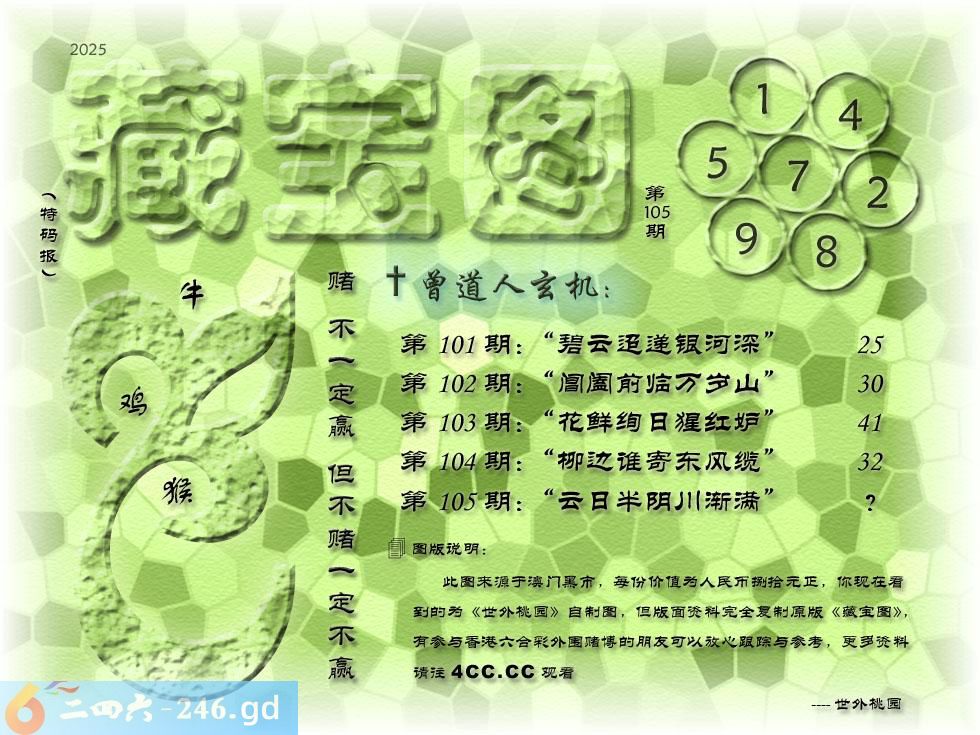 六合彩105期藏寶圖 新:云日半阴川渐满 老:忆君不见令人老 禁:兔 禁:6尾 玄機字:《知》