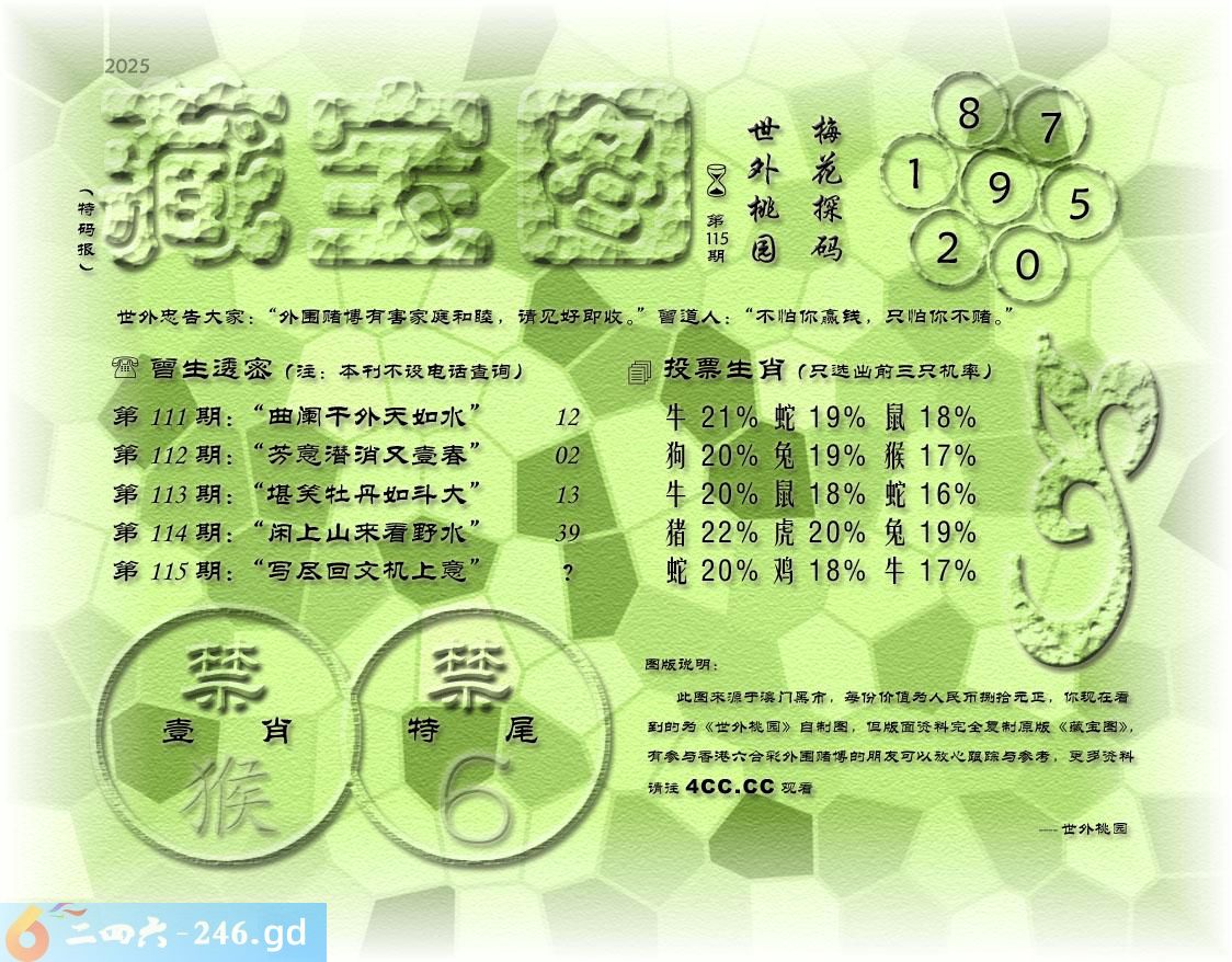 115期藏寶圖 新:银钩华榜伍云间 老:写尽回文机上意 禁:猴禁:6尾玄機字:《葛》