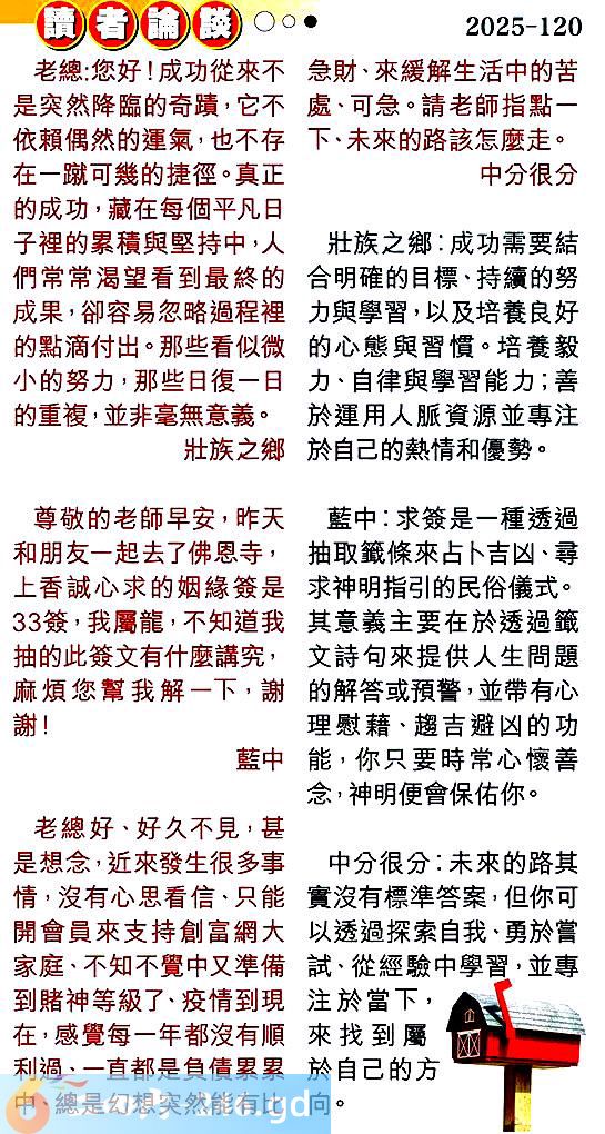 3.老總好、好久不見,甚是想念,近來發生很多事情,沒有心思看信只能開會員來支持創富網大家庭、不知不覺中又準備到賭神等級了、疫情到現在,感覺每一年都沒有順利過、一直都是負債累累中、總是幻想突然能有比急財、來緩解生活中的苦處、可急。請老師指點一下、未來的路該怎麼走。中分很分