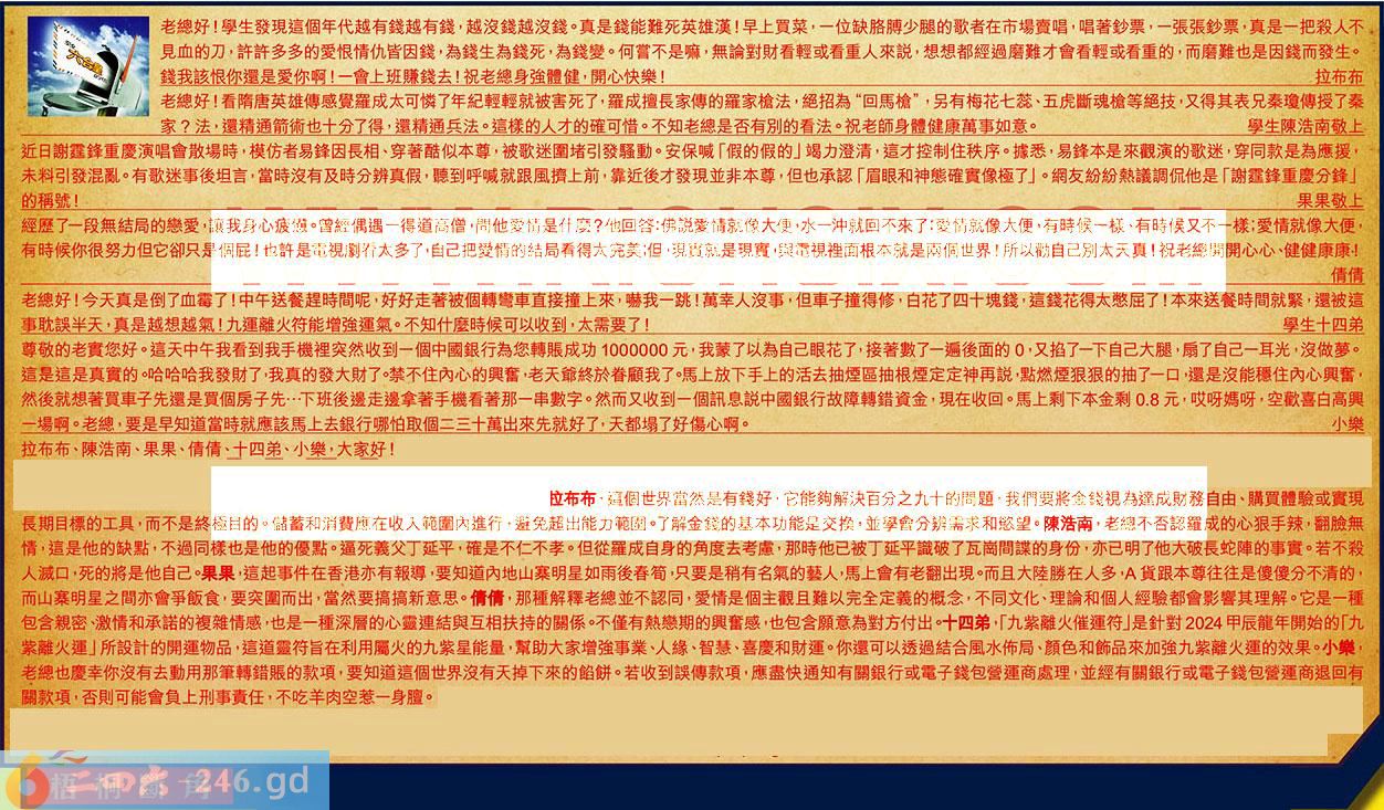 【1】.老總好!學生發現這個年代越有錢越有錢,越沒錢越沒錢。真是錢能難死英雄漢!早上買菜,一位缺胳膊少腿的歌者在市場賣唱,唱著鈔票,一張張鈔票,真是一把殺人不見血的刀,許許多多的愛恨情仇皆因錢,為錢生為錢死,為錢變。何嘗不是嘛,無論對財看輕或看重人來說,想想都經過磨難才會看輕或看重的,而磨難也是因錢而發生。錢我該恨你還是愛你啊!一會上班賺錢去!祝老總身強體健,開心快樂!拉布布