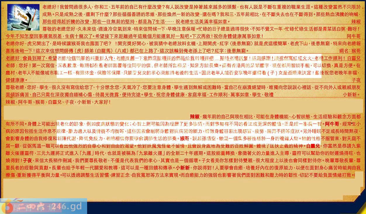 【3】.老總你好,虎兄開出了,是時候讓猴哥我也露面了吧?!開完獎好開心,被我猜中老總放料玄機,上期開虎,紅字《後患無窮》就是虎這樣簡單,老虎下山,後患無窮特來向老總報喜馬後饱一下!這次來信想問師傅(虎)師弟(白龍馬)(八戒)都已在上路了,這次該輪到俺老孫上了吧?紅字:後患無窮。網名:猴哥