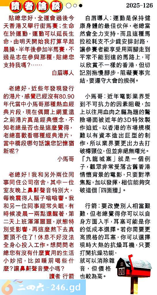 1.貼總您好,全運會過後今天香港又舉行街馬賽;生命在於運動,運動可以延長生命,由明天開始我打算早起晨操,半年後參加半馬賽,不過是志在參與那種,貼總您支持我嗎?......白眉導人