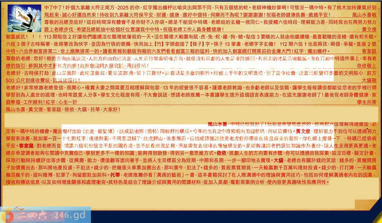 【1】.中了中了!好個九紫離火符正南方,2025的你,紅字獨出機杼比喻突出與眾不同,只有五個號的蛇。老師神機妙算啊!可惜沒一碼中特。有了桃木加持運氣好到飛起來,誠心好運自然來!待收到九紫離火符保平安,財運,健康,還好中個特,何樂而不為呢?謝謝謝謝!祝福老師健康長壽,歲歲平安!風山水喜敬