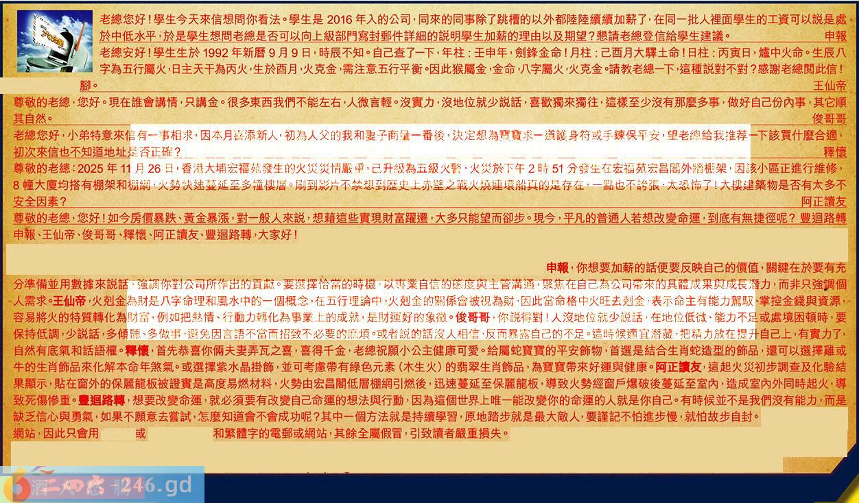【5】.尊敬的老總:2025年11月26日,香港大埔宏福苑發生的火炎災情嚴重,已升級為五級火警,火災於下午2時51分發生在宏福苑宏昌閣外牆棚架,因該小區正進行維修,8幢大廈均搭有棚架和棚網,火勢快速蔓延至多幢樓層。刷到影片不禁想到歷史上赤壁之戰火燒連環船真的是存在,一點也不誇張,太恐怖了!大樓建築物是否有太多不安全因素?阿正讀友