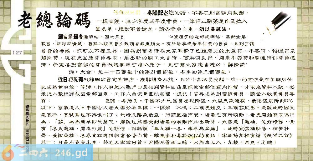 六合彩127期:六合皇金句/老总论码/萧公子/林大师/五行夺码/老总信箱截图