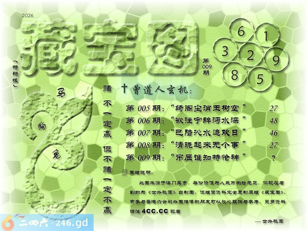 009期藏寶圖 新:吊屈谁知特怆神 老:小男供饵妇搓丝 禁:猴禁:4尾玄機字:《醋》