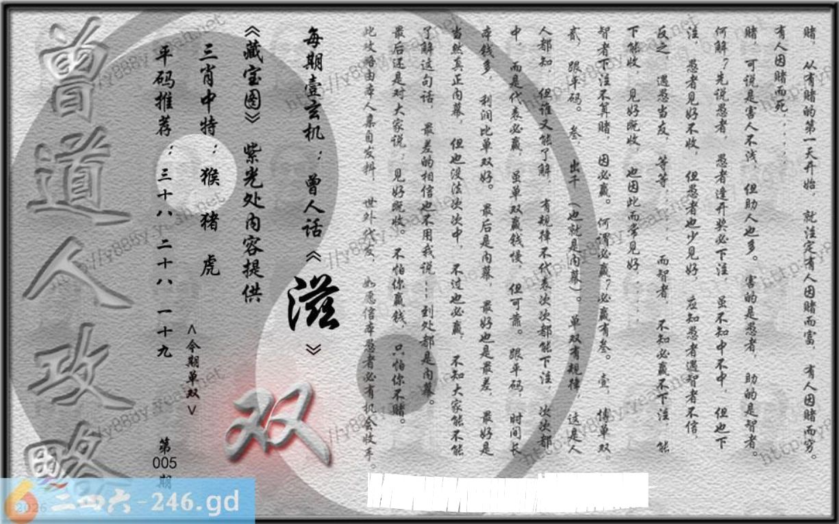 六合彩005期:跑狗玄機/密圖詩/粤彩三语/特碼后语/另版四字梅花诗/藏寶圖