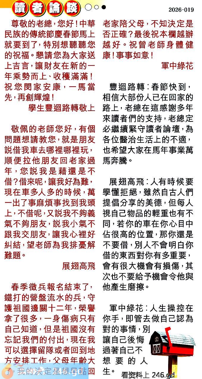 〖豐迴路轉〗:春節快到,相信大部份人已在回家的路上,老總在這感謝多年來讀者們的支持,老總定必繼續緊守讀者論壇,為各位醫治生活上的不適,也希望大家在馬年事業萬馬奔騰。