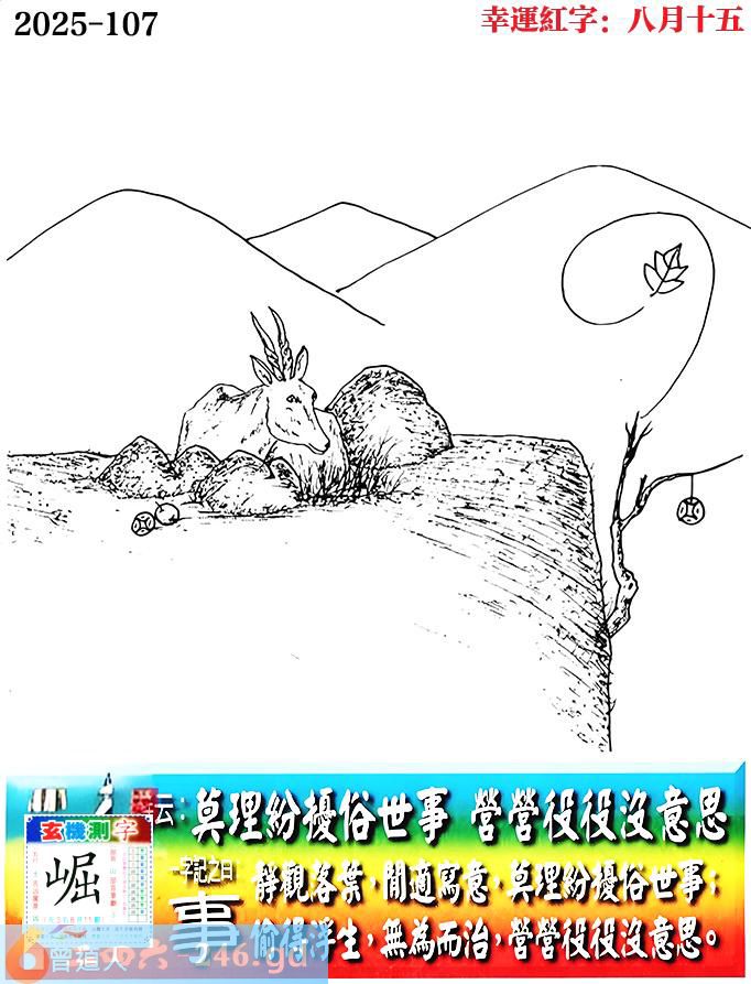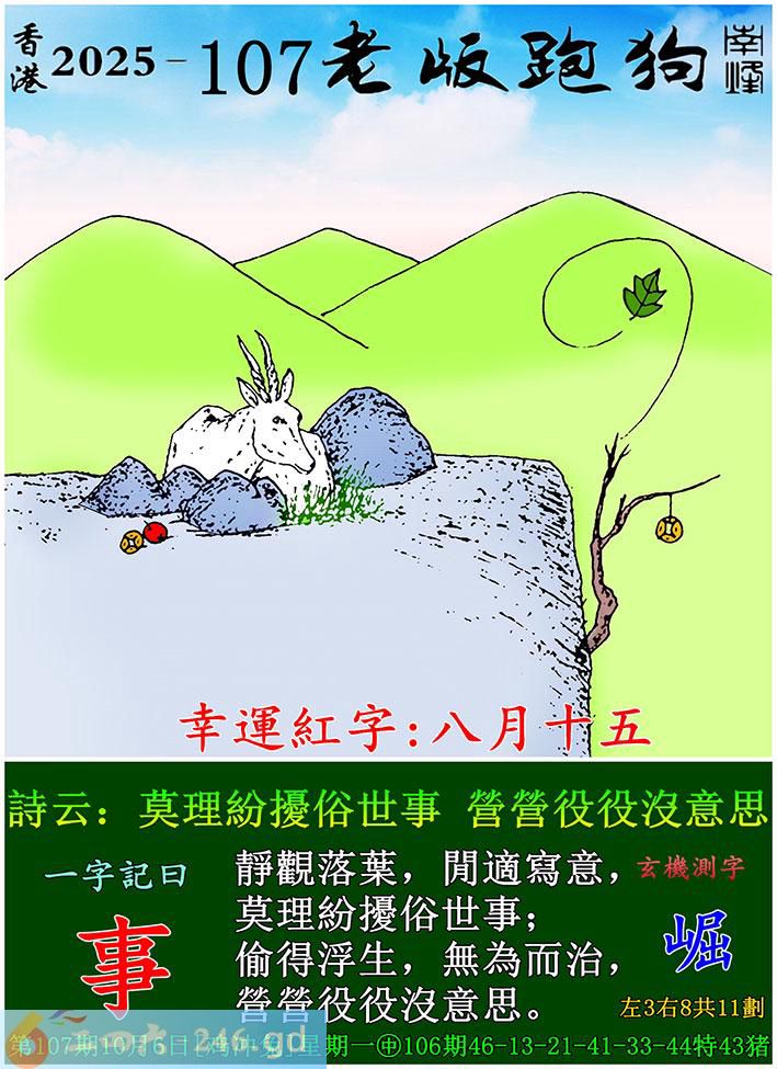 107期老版跑狗一字記之曰:【事】 詩雲:莫理紛擾俗世事,營營役役沒意思。 靜觀落葉,閒適寫意,莫理紛擾俗世事; 偷得浮生,無為而治,營營役役沒意思。 玄機測字:《崛》
