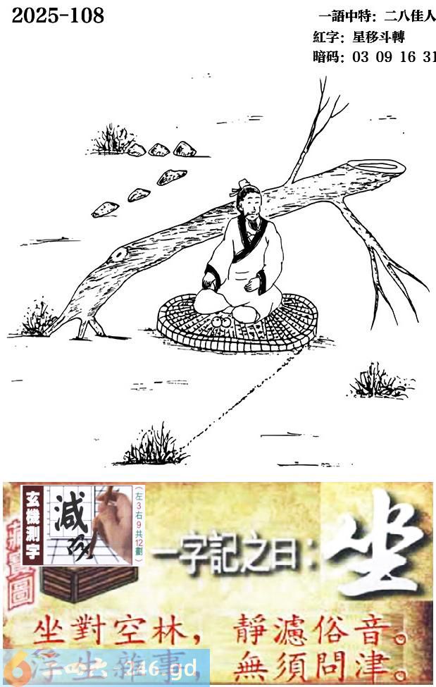 108期跑狗一字記之曰:【坐】 坐對空林,靜濾俗音。 浮生雜事,無須問津。 玄機測字:《減》 一語中特:二八佳人