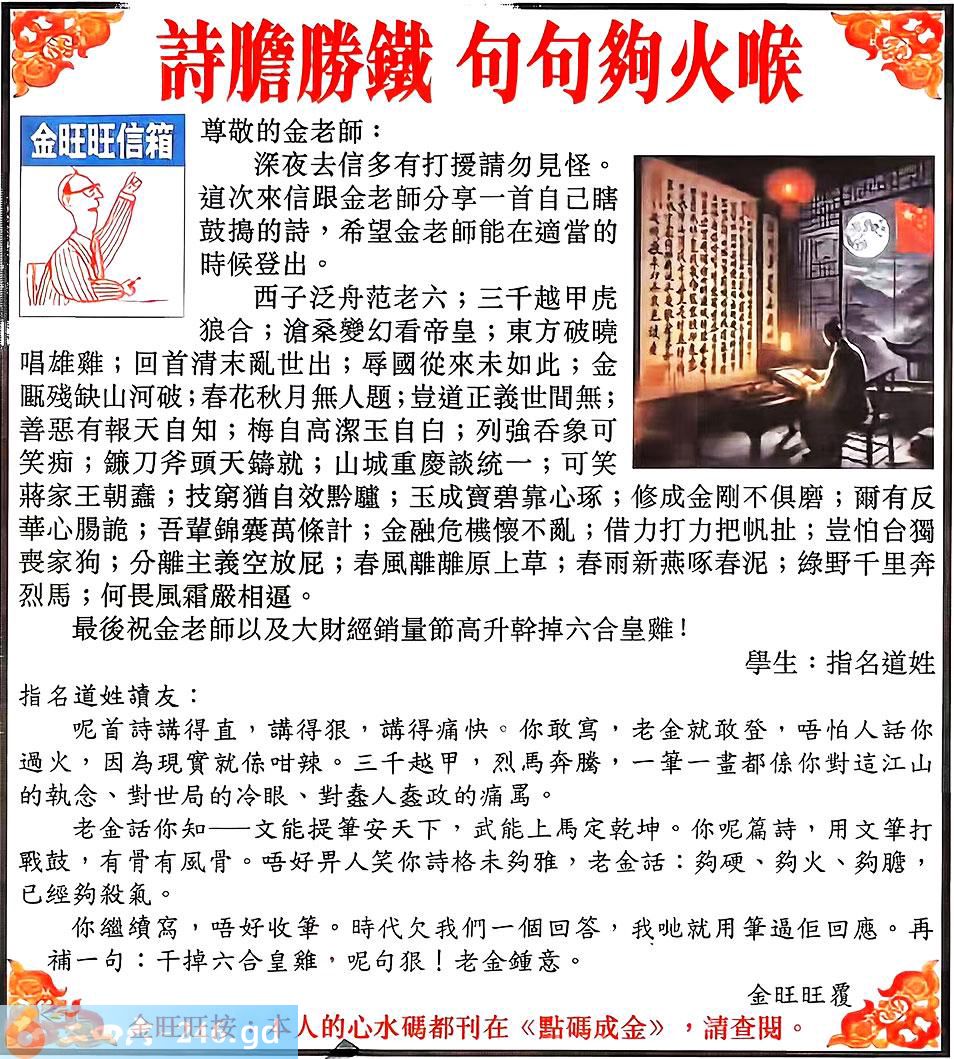 六合彩111期:金旺旺信箱彩民推荐→→《詩膽勝鐵 句句夠火候》