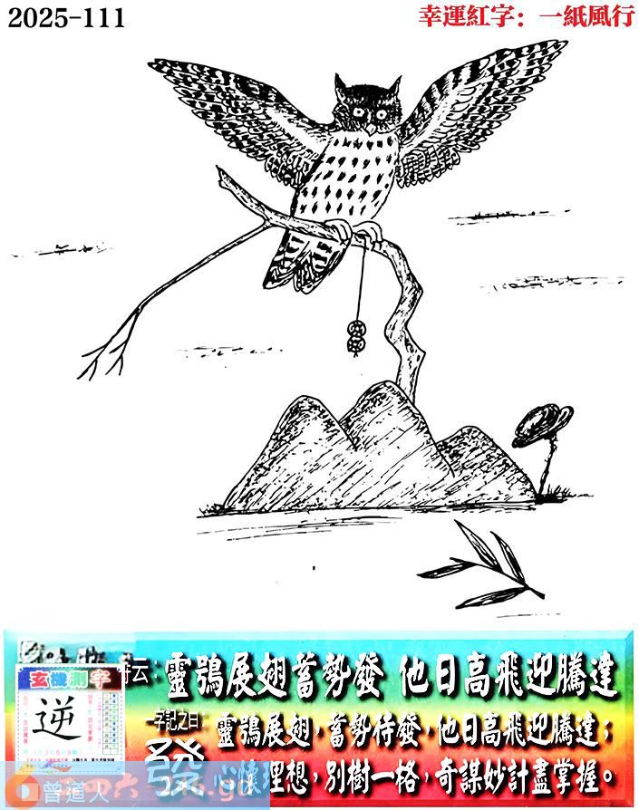 111期老版跑狗一字記之曰:【發】 詩雲:靈鴞展翅蓄勢發,他日高飛迎騰達。 靈鴞展翅,蓄勢待發,他日高飛迎騰達; 心懷理想,別樹一格,奇謀妙計盡掌握。 玄機測字:《逆》