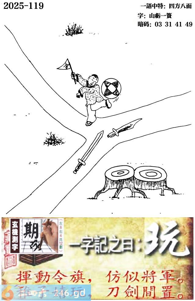 119期跑狗一字記之曰:【玩】 揮動令旗,仿似將軍。 稚子嬉玩,刀劍間置。 玄機測字:《期》 一語中特:四方八面