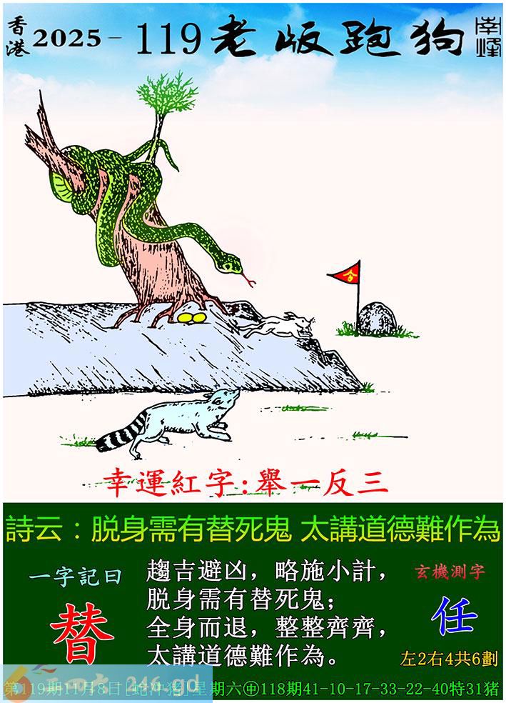 119期老版跑狗一字記之曰:【替】 詩雲:脱身需有替死鬼,太講道德難作為。 趨吉避凶,略施小計,脱身需有替死鬼; 全身而退,整整齊齊,太講道德難作為。 玄機測字:《任》