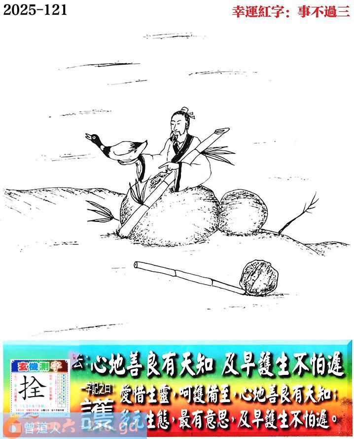 121期老版跑狗一字記之曰:【護】 詩雲:心地善良有天知,及早護生不怕遲。 愛惜生靈,呵護備至,心地善良有天知; 多元生態,最有意思,及早護生不怕遲。 玄機測字:《拴》