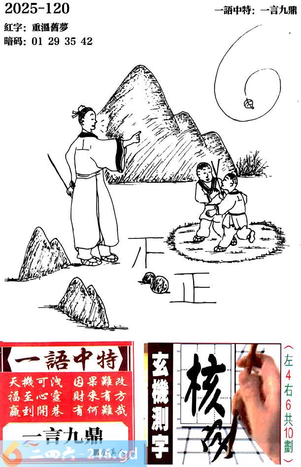 120期跑狗一字記之曰:【正】 稚子相爭,先生導正。 戒驕戒躁,虛心向上。 玄機測字:《核》 一語中特:一言九鼎