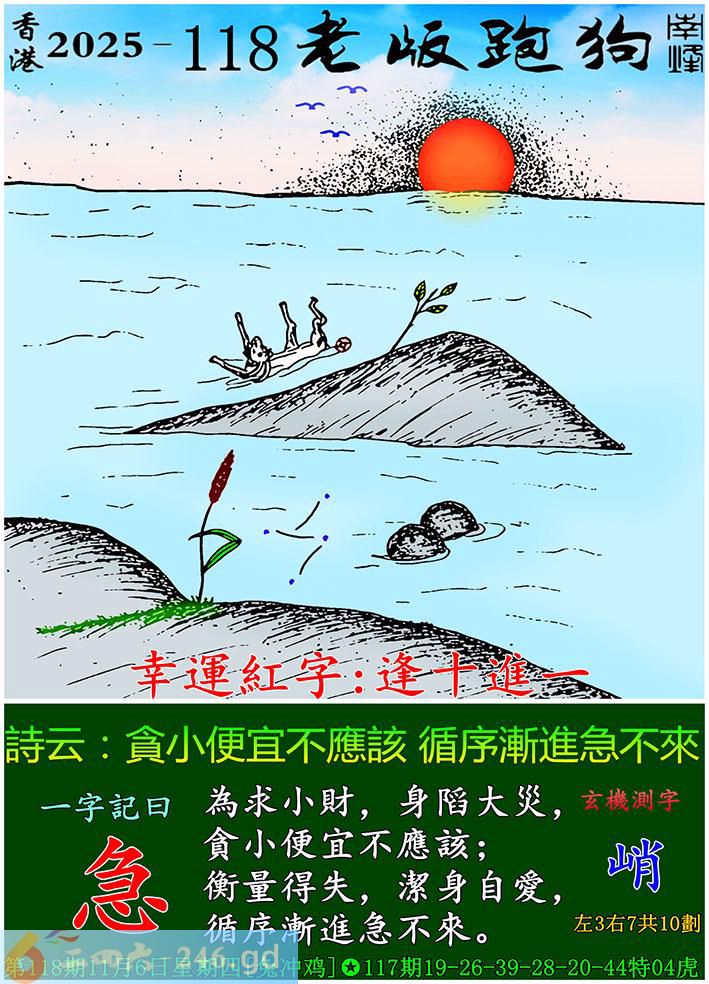 六合彩118期老版跑狗一字記之曰:【急】 詩雲:貪小便宜不應該,循序漸進急不來。