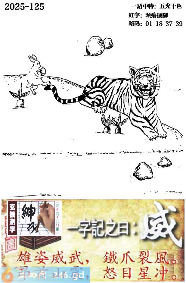 125期跑狗一字記之曰:【威】 雄姿威武,鐵爪裂風。 昂首山震,怒目星沖。 玄機測字:《紳》 一語中特:五光十色