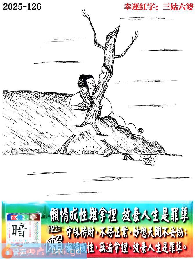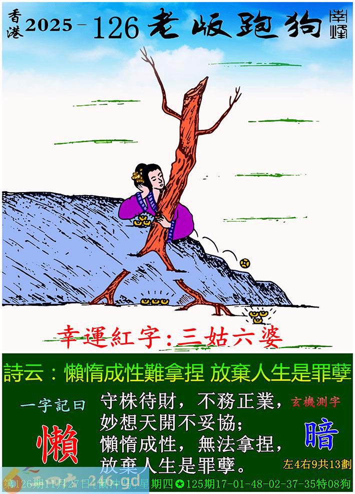 126期老版跑狗一字記之曰:【懶】 詩雲:懶惰成性難拿捏,放棄人生是罪孽。 守株待財,不務正業,妙想天開不妥協; 懶惰成性,無法拿捏,放棄人生是罪孽。 玄機測字:《暗》