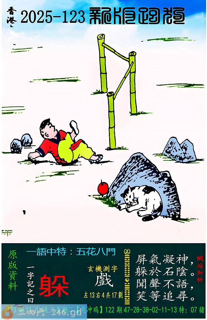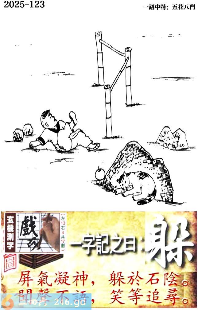 123期跑狗一字記之曰:【躲】 屏氣凝神,躲於石陰。 聞聲不語,笑等追尋。 玄機測字:《戲》 一語中特:五花八門