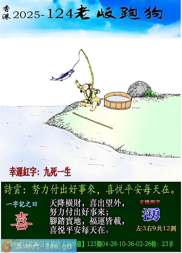 124期老版跑狗一字記之曰:【喜】 詩雲:努力付出好事來,喜悦平安每天在。 天降橫財,喜出望外,努力付出好事來; 腳踏實地,福運皆載,喜悦平安每天在。 玄機測字:《湧》