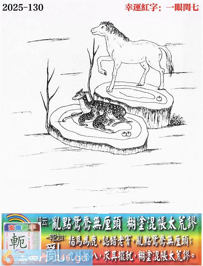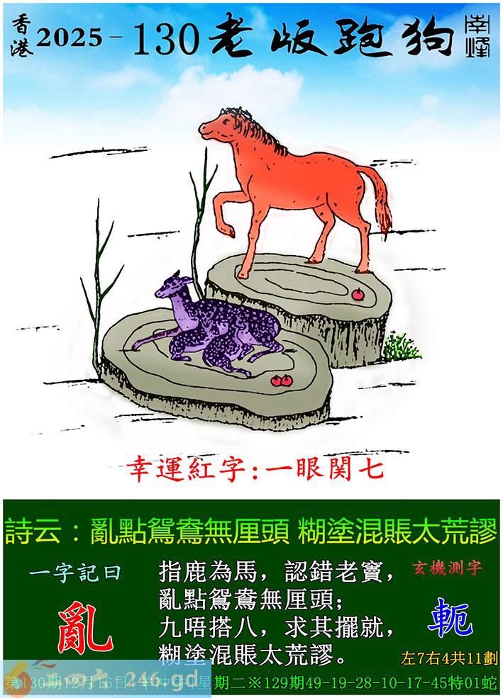 130期老版跑狗一字記之曰:【亂】 詩雲:亂點鴛鴦無厘頭,糊塗混賬太荒謬。 指鹿為馬,認錯老實,亂點鴛鴦無厘頭; 九唔搭八,求其擺就,糊塗混賬太荒謬。 玄機測字:《軛》