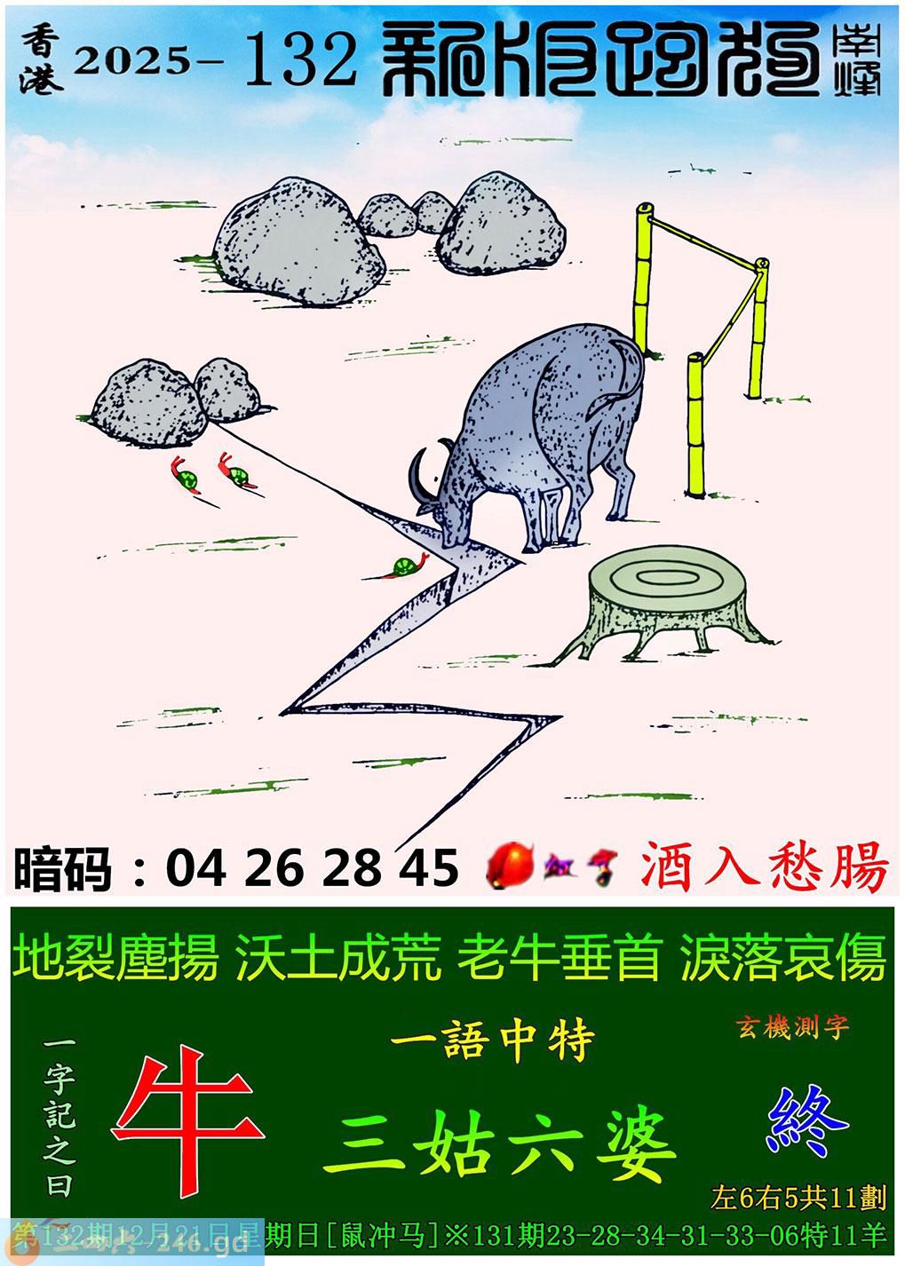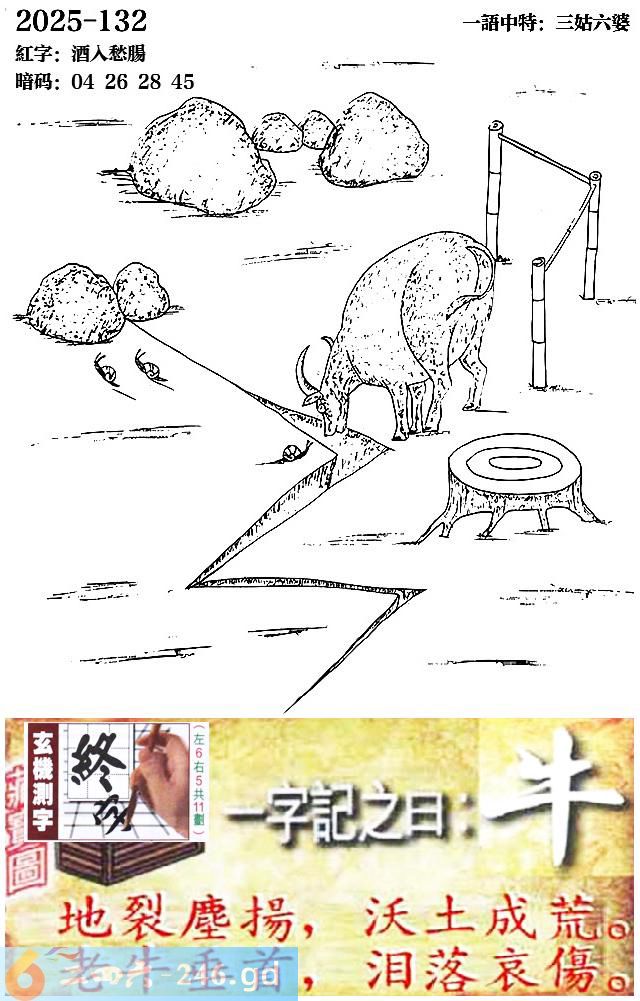 132期跑狗一字記之曰:【牛】 地裂塵揚,沃土成荒。 老牛垂首,淚落哀傷 玄機測字:《終》 一語中特:三姑六婆