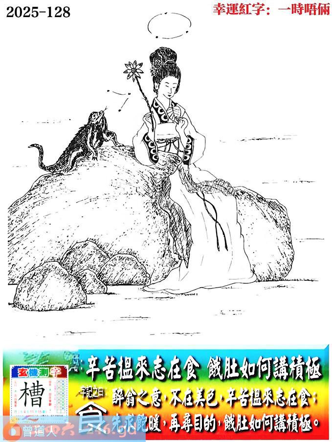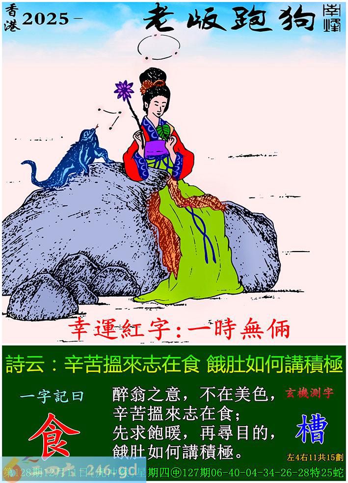 128期老版跑狗一字記之曰:【食】 詩雲:辛苦搵來志在食,餓肚如何講積極。 醉翁之意,不在美色,辛苦搵來志在食; 先求飽暖,再尋目的,餓肚如何講積極。 玄機測字:《槽》