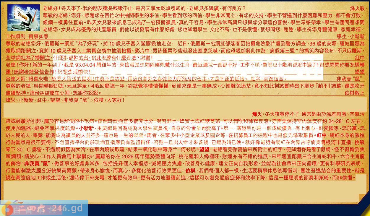 〖望望〗:老總看見你寫信來所附上的紅字,便知道你是看了假網,怪不得翰到焦頭爛額,請放心,工作人員會馬上聯聚你。屬難的你在2026馬年運勢整體向好,桃花運和人縁極旺,財運亦有不錯的進展。來年適宜配戴三合生肖蛇和牛,六合生肖龍的飾物。