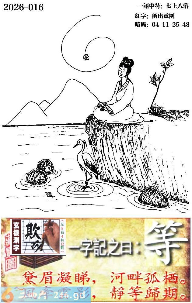 六合彩015期跑狗一字記之曰:【等】 黛眉凝睇,河畔孤棲。 風牽雲影,靜等歸期。