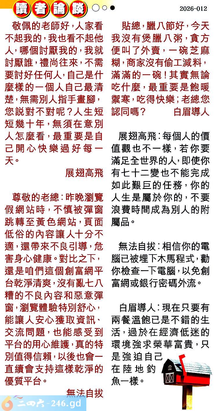 第012期讀者論談 1.敬佩的老師好,人家看不起我的,我也看不起他人,哪個討厭我的,我就討厭誰,禮尚往來,不需要討好任何人,自己是什麼樣的一個人自己最清楚,無需別人指手畫腳,您説對不對呢?人生短短幾十年,無須在意別人怎麼看,最重要是自己開心快樂過好每一天。展翅高飛 〖展翅高飛〗:每個人的價值觀也不一樣,若你要滿足全世界的人,即使你有七十二變也不能完成如此艱巨的任務,你的人生是屬於你的,不要浪费時間成為别人的附屬品。 2.尊敬的老總:昨晚瀏覽假網站時,不慎被彈窗跳轉至黄色網站,頁面低俗的內容讓人十分不適,還帶來不良引導,危害身心健康。對比之下,還是咱們這個創富網平台乾淨清爽,沒有亂七八糟的不良內容和惡意彈窗,瀏覽體驗特別舒心,能讓人安心獲取資訊、交流問題,也能感受到平台的用心維護,真的特別值得信頼,以後也會一直须會支持這様乾承的優質平台。無法自拔 〖無法自拔〗:相信你的電腦已被埋下木馬程式,勸你檢查一下電腦,以免創富網或銀行密碼外流。 3.貼總,臘八節好,今天我沒有煲臘八粥,貪方便叫了外賣,一碗芝麻糊,商家沒有偷工減料,滿滿的一碗!其實無論吃什麼,最重要是鲍暖禦寒,吃得快樂;老總您認同嗎?白眉導人 〖白眉導人〗:現在只要有兩餐溫飽已是不錯的生活,過於在經濟低迷的環境強求榮華富貴,只是強迫自己在陸地釣魚一樣。