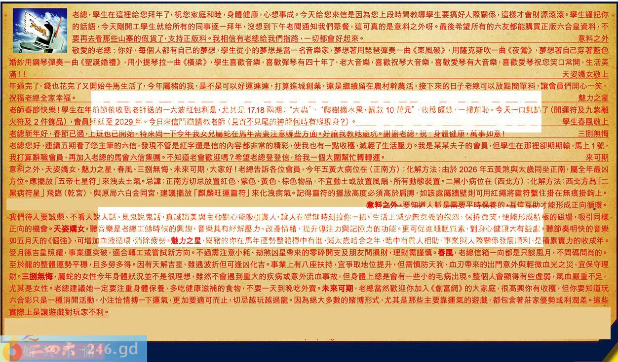 【6】.老總您好,連續五期看了您主筆的六信,發現不管是紅字還是信的內容都非常的精彩,使我也有一點收穫,減輕了生活壓力。我是某某夫子的會員,但學生在那裡卻期期輸,馬上1號,我打算辭職會員,再加入老總的馬會六信集團。不知道老會歡迎嗎?希望老總登登信,給我一個大圍幫忙轉轉運。未來可期