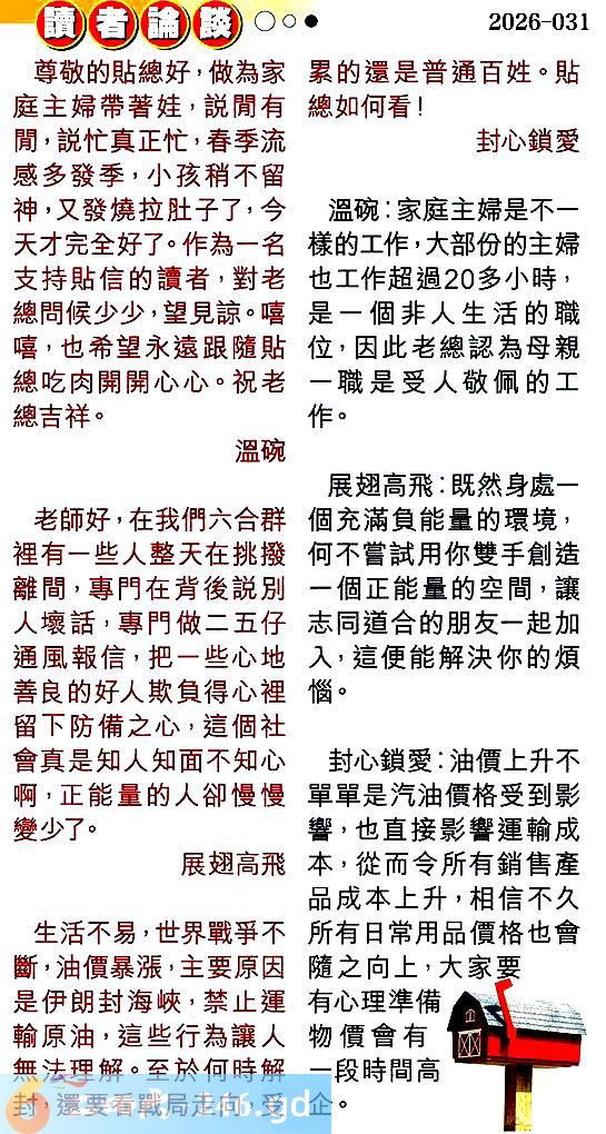 1.尊敬的貼總好,做為家庭主婦帶著娃,説閒有閒,説忙真正忙,春季流感多發季,小孩稍不留神,又發燒拉肚子了,今天才完全好了。作為一名支持貼信的讀者,對老總問候少少,望見諒。嘻嘻,也希望永遠跟隨貼總吃肉開開心心。祝老總吉祥。溫碗