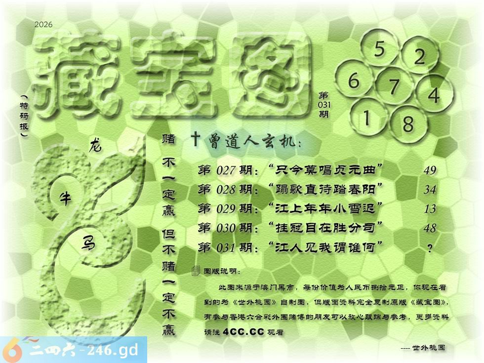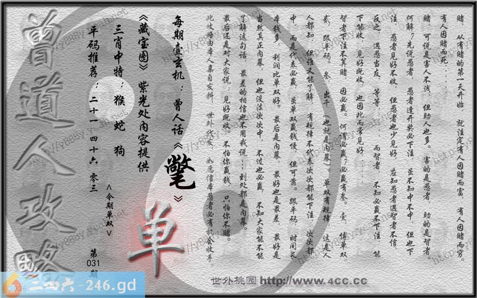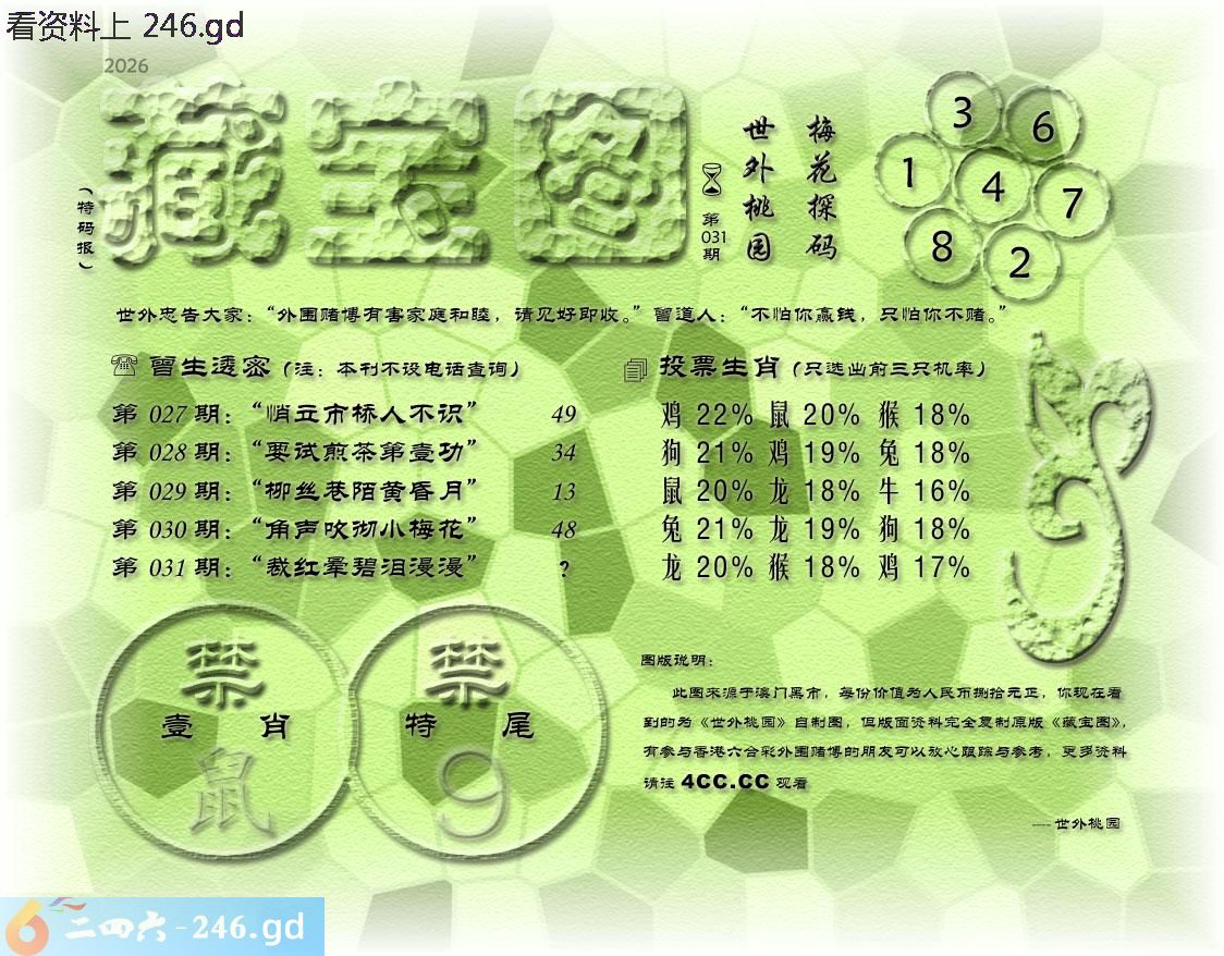 031期藏寶圖 新:江人见我谓谁何 老:裁红晕碧泪漫漫 禁:鼠禁:9尾玄機字:《㲠》